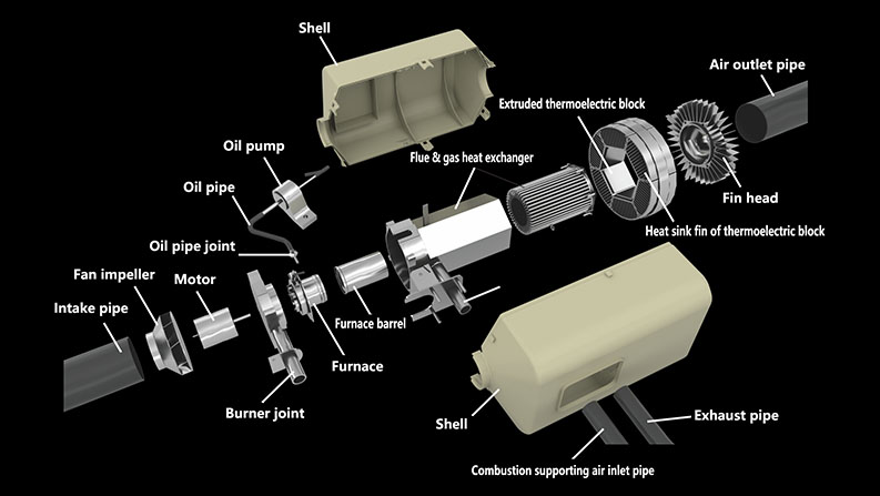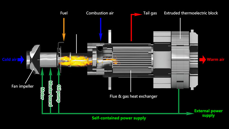The operation principle of thermoelectric space heaters is shown in the picture above. Thermal energy of high temperature is generated by burning oil in the combustor, and then it either warms up the cool air to provide heating, or converts into electricity through the thermoelectric module to drive the heater itself or external units. |